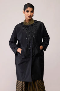 Make a chic statement this party season in our Diana coat! Intricately hand-embroidered tonal floral details add a distinctive character to an exquisitely crafted piece that can be worn on it own as a dress or paired with a dressy top and flared pants!