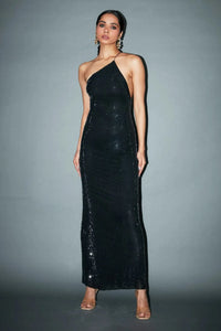 Featuring the Dililah Black Dress by ITRH's Diwali Jaaneman Collection, this elegant black dress is crystal-embellished with a one-shoulder strap design, exuding modern glamour and timeless sophistication for a bold, chic look at any occasion.