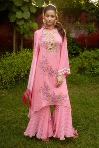 Featuring the Dilkush Pink Kurta Sharara Set by Nikasha’s Dilruba Collection, this pink georgette kurta showcases Badal Bibi prints with delicate embroidery. It is paired with a matching printed double-layer georgette sharara and a printed skinny scarf finished with ombré fringe and bead detailing.