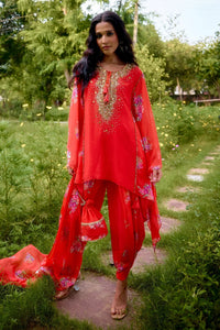 Featuring the Dilruba Coral Kurta by Nikasha’s Dilruba Collection, this coral georgette kaftan is adorned with Badal Bibi prints and delicate embroidery. It is paired with a panelled dhoti and a printed skinny scarf for a contemporary yet graceful silhouette.
