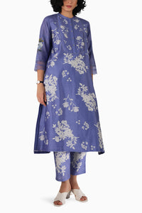 Featuring the Twillight Tunic in Yuri print silk chanderi, paired with the matching pants, creates a captivating ensemble that blends elegance with a touch of whimsy. This ensemble is a timeless addition to any wardrobe, offering a perfect blend of traditional craftsmanship and contemporary design.