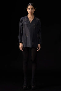 The Disk Black Top is a refined and elegant garment made from luxurious silk fabric, known for its smooth texture and natural sheen. The silk material drapes beautifully, giving the top a soft, fluid silhouette that feels as exquisite as it looks. The rich black color of the top enhances its timeless versatility, making it suitable for both day and evening wear.