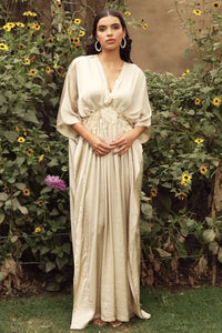 Indulge in luxurious comfort and effortless elegance with our exquisite Divine Sequins Embroidered Kaftan in Nude color. Crafted from the finest flowing fabric, this gown drapes gracefully, enveloping you in a cloud of sophistication and grace. The cinched waist adds a touch of definition, flattering your figure while allowing for freedom of movement. The waist is also adorned with a delicately Embroidered patch that adds the timeless beauty to the gown. Whether you're strolling along sun-kissed shores or attending a glamorous soirée, this gown promises to elevate your style and leave a lasting impression.