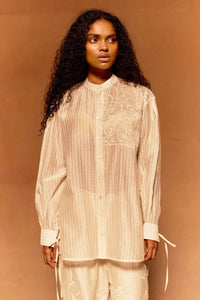 The Dobutsu Mandarin Shirt brings a playful twist to aclassic silhouette with its embroidered panels and tie-up cuffs. Crafted from striped Chanderi, this shirtcombines a traditional mandarin collar with moderndetailing, making it a versatile addition to elevate youreveryday wardrobe. Its unique blend of charm andfunctionality adds an unexpected touch to casual orrefined looks alike.
