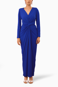 Featuring the Dolce Gown by House of Exotique. This exquisite gown boasts a V-neck, a slit, and a back zipper fastening. With its drape style and full sleeves, crafted from georgette fabric in captivating blue, it offers a tailored fit, perfect for special occasions.