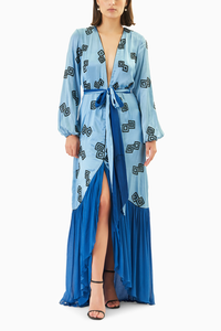 Pale blue, with a beautiful deep neckline and hand-embroidered geometrical motifs - the Donna Dress is a head - turner. Wear this for a special occasion or a date night.