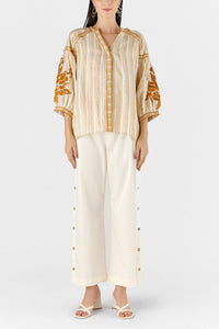 The golden stripe top is in 100% linen from the South of India and it features hidden front buttons, puff sleeves, and hand-embroidery in brown color.