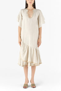The Dorado dress is made of off-white handloom cotton from India. It features metallic gold embroidery around the deep neckline, ruffles sleeves, and slanted bottom ruffle.
