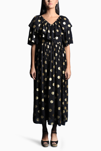 Featuring the V Neck Midi Dress with Ruffle Detail by Swatee Singh in classic Black adorned with Polka Dot print. Crafted from luxurious heavy georgette fabric, this dress exudes elegance with a playful twist.