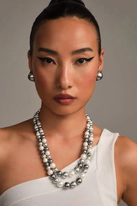 Featuring the Double Silver Mixed Graded Pearl Necklace by Anaash, a 20-inch necklace combining silver, dark silver, and white manufactured pearls in a graded design. This elegant piece adds depth and sophistication to any outfit.