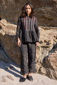 The Doug Black Top features a front-open design with elegant pintuck detailing and beautiful floral vine patterns, creating a timeless and sophisticated look. Paired with the Carly Black Trouser, a stylish pull-on design with convenient pockets and a delicate scalloped hem, this combination offers a chic, comfortable, and practical addition to any wardrobe.