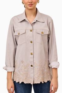 Soft grey button down shirt featuring front flap pockets and a floral pattern embroidered scalloped hem .