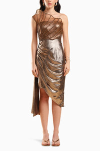 This evening dress exudes sparks with its metallic rich brown fabric that drapes and accentuates the body, following its curves. This dress features a 3D embellished structure with a flowy trail that together form the perfect pair to catch the attention and make you stand out.