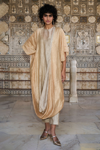 Hand draped and pleated longline kaftan top in soft metallic tissue. Relaxed fit. Hand dyed ombré effect toward the sides. Round neck with loop and button closure and hand smocked elastic panel in the back. Coms with a cami.