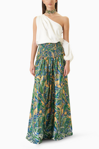 One-shoulder top in textured ivory crape fabric. Single cutout sleeve draped over the opposite shoulder. The top is elasticated at the bottom hem and single sleeve cuff. Maxi-length skirt in flowy satin fabric. Contrast mustard print at the bottom with allover multicolour paisley print in tones of blue and green. Exaggerated smocking detail at the high waist accentuates the fit and flare silhouette.