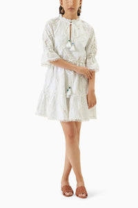 With it's weightless fa brica tion a nd mood-lifting deta ils this white dress resting just a bove the knee is in cotton linen with delica te tona l embroidered pa tches sewn together, finishing a nd deta iling with flora l a nd fine tona l la ces to give a complete chique look. Neckline a nd wa ist finishing with dra wstrings a nd ha nd ma de ta ssels.