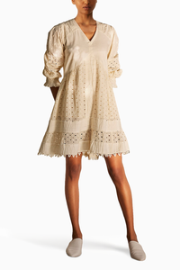 Featuring an off-white schiffli cotton dress with pin tucks at the neckline and the center front. The dress comes with smocking at the sleeves and lacework along the hemline.