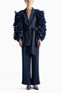 Featuring our Dreamy coord set, crafted in luxurious Cherry crepe. This blazer set, accompanied by matching pants, accentuated by intricately detailed organza sleeves and includes a detachable belt for added versatility. Elevate your style with this elegant ensemble.