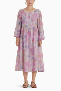 Our Dreamy Dress is made from the finest silk modal. The all-over print, originally handmade in watercolor, is inspired by the concentric form of the ranunculus flower, making it a true work of art. This floral dress features a round neckline, and a full sleeve ruched beautifully at the hem.