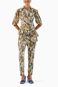 Ikat print co-ord set with high low hem is ideal for any date. Features collared shirt with puffy sleeves, lace detailing and belt in front. Paired with same slim fit pants.