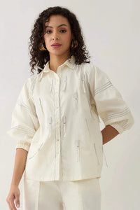 Featuring playful texture and drip details, the Drip Shirt in Offwhite blends classic style with unique design. Short puff sleeves with elastic cuffs and topstitch accents add relaxed charm. Pair with sneakers or ankle boots for a chic, casual look that highlights the shirt’s bold character.