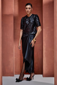 Featuring Drop Dead Gorgeous Black Draped Skirt Set by Bohochic's Lumiere Collection. A classic sequinned blouse on tulle paired with a draped satin silk skirt creates a striking coord set, perfect for milestone celebrations with undeniable glamour and sophistication.