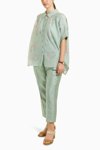 This refreshing ensemble features a mint-colored kaftan shirt in Mul Chanderi, beautifully detailed with delicate embroidery for an elegant touch. Paired with straight pants in Silk Chanderi, it offers a harmonious blend of sophistication and comfort. The luxurious fabrics and thoughtful design make this outfit perfect for a stylish, yet relaxed look for both day and evening occasions.