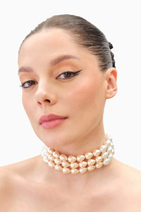 The Drops Pearl Choker in Peach & White features a delicate arrangement of lustrous white and soft peach pearls, cascading gracefully in a droplet-like design. The contrasting colors create a harmonious and elegant look, with the warm peach tones adding a subtle pop of color against the classic white.