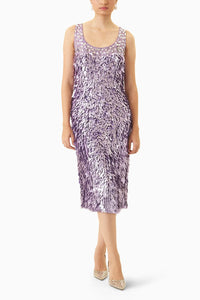 Featuring  Dua Electric Grape Dress by Kangana Trehan. The Dua dress is meant to outshine. Fully donned in embellishments, this midi georgette dress is a classic silhouette that moves with you.