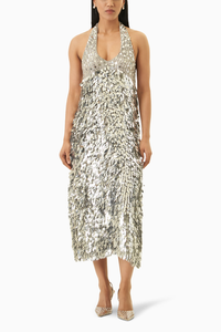 Featuring Dua Steel Silver Dress by Kangana Trehan's Rush Hour Collection. This dress is meant to outshine. Fully donned in embellishments, this midi georgette dress is a classic silhouette that moves with you.