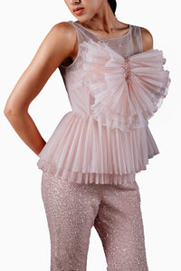 Featuring the quartz pink cabbage top, this stunning piece is crafted from dual-tone pleated organza, creating a visually captivating texture and movement. The top is designed with an elevated fan structure on the bodice, adding a dramatic and sophisticated flair. Intricate 3D gitch hand embroidery enhances the garment with detailed, tactile artistry. The pre-pleated bust and fitted bodice offer a flattering silhouette, while the peplum hem introduces a touch of elegance and refinement. Perfect for making a bold yet graceful statement, this top combines innovative design with exquisite craftsmanship.