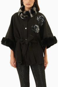 Miri's cla ssic bla ck ca pe in signa ture soft wool blend is highlighted by a fa ux chinchilla fur colla r with fa ux fur on the sleeves a s well . It ca n be worn with the a ccompa nying belt to highlight the wa ist- or - without - for a rela xed flowing dra pe.