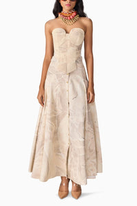 Featuring Dull Scratch Flower Agnes Corset with Ziva Skirt by Saaksha & Kinni's Nirah Collection. The strapless corset showcases an abstract floral print, an asymmetric silhouette, and intricate quilting detailing. Paired with an extra high-waist, flared, buttoned-down maxi skirt, this ensemble blends structured elegance with contemporary sophistication.