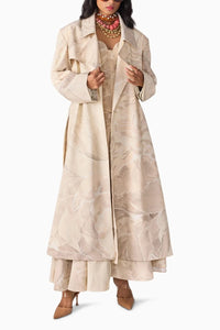 Featuring Dull Scratch Flower Harper Trench with Agnes Corset & Ziva Skirt by Saaksha & Kinni's Nirah Collection. This statement ensemble includes an oversized trench coat with an abstract floral print, a strapless asymmetric quilted corset, and an extra high-waist flared maxi skirt with button-down detailing, blending structure with effortless elegance.