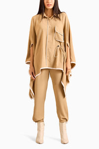 An Italian Twill two piece set featuring a cape shirt with a contrast trim and oversized pocket detailing. Paired with matching jumper pants.