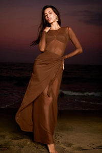 Dune is a versatile sheer mesh dress designed to transition effortlessly from day to night with its thoughtful layering. Lightweight and breathable, this dress slips effortlessly over swimwear for an easy beachside coverup and transitions seamlessly to an elevated evening look when paired with the Crest Sarong.