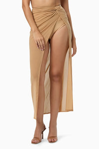 Designed for those who appreciate understated sophistication, the Oasis sarong is an essential wrap for seamless transitions between ocean-side ease and elevated evening moments. Crafted in a sheer, lightweight stretch fabric, this piece slips on effortlessly and gathers at the waist with a sculptural twist, creating natural folds that flatter the form. The high side slit elongates the silhouette - whether layered over swimwear for a poolside brunch or styled with heels for an evening out.