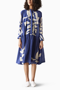 Featuring a navy blue lino print mul drop waist tent dress with an invisible placket, flounced bottom tier and full sleeves.