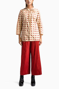 Seekers set is inspired by enchanting travels accentuating suave with comfort.Urbane utility shirt allows us to pursue our ambitions & aspirations fearlessly. Constructed in solid 100% cotton fabric letting you breathe features our original bold hand-block printed pattern crafted with natural colors by hand in Bagru. Paired with our complimenting colored solid comfort fit elasticated trouser finished with intriguing button cross details crafted by hand delicately .