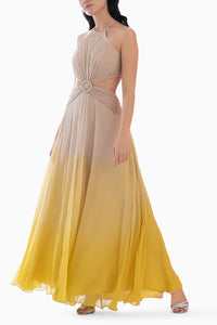 Duskin Love is a maxi dress artistically ruched and pleated halter Neck with side cutout details fitted till the waist. the style has interesting ring neck detailing and strap detailing at the back with color tassels given. The Skirt is is cut in full circle and the georgette falls from the waist to the floor featuring a beautiful center slit showing a glimpse of leg only when you want to. Artistically pleated on the dummy and fitted with a beautiful cutout detailing on the front and sides. This is a pure delight in terms of way its cut and ruched and draped and hand dip dyed. The key features are the halter front ruching, backless with straps running on the back, and beautiful tassels hanging down the straps.