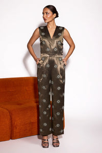 Crafted from luxurious satin, this sleeveless jumpsuit features intricate embroidery all over. Designed with a defined waist and a tailored silhouette, it makes an elegant statement for evening soirées or cocktail gatherings.