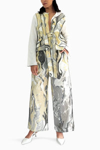 The Dusty Miller Co-ord Set is expertly hand-crafted, featuring an organic style line concept that brings flow and structure to each piece. The shirt and pants are designed with a refined blend of white, soft grey, and hints of gold, creating a harmonious and sophisticated color palette. The visible out stitching in contrast thread enhances each organic line, emphasizing the high level of detail and quality that goes into every seam. With an inside-out approach to stitching, this set proudly showcases its craftsmanship, making it as beautiful on the inside as it is on the outside.
