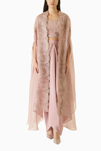 Redefine your charming look with this Dusty Pink Organza Fusion Set. A classic wrinkle blouse with organza cape and lungi skirt is cut in satin fabric, it assures a soft and soothing touch against the skin. Style this set with a pair of high heels & statement earrings.