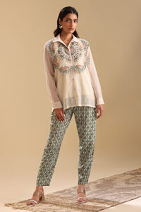 The Beige Eraya Applique Co-ord Set featues Asymmetrical Top in Handloom Cotton is a beautifully crafted piece, featuring delicate applique detailing that adds a unique texture and charm to the soft beige fabric. The asymmetrical design creates a modern and flattering silhouette, while the handloom cotton ensures comfort and breathability. Paired with Printed Green Muslin Pants, this ensemble offers a vibrant contrast, with the green prints adding a playful yet sophisticated touch.