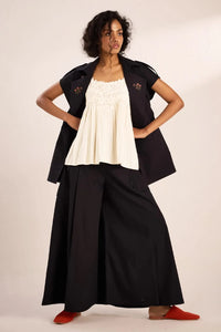 An all-black poplin pants featuring delicate embroidery. The flared pants include flap pockets for added style and functionality.