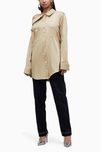 The Beige cotton broken rock shirt is a collared off-shoulder with a up down hemline. It is a full sleeve button down shirt with front pockets. The threadwork detail on the pockets and hemline are minimal this piece is made to perfection and falls great on the body. The style is great for the hot summer months. The style is elegant and edgy. Pair it with blue jeans or even culottes for a relaxed look.