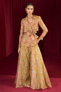 Featuring the Echo Jacket Set from Ridhi Mehra's Jazz-A-Jashn Collection. This chic ensemble showcases an olive green printed organza trench jacket paired with flared pants and a stylish tie-up belt. Perfect for a trendy look, it effortlessly combines elegance with contemporary flair!