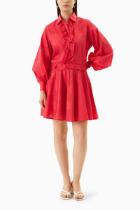 Red amaryllis dress is crafted in luxurious cotton satin fabric and this dress details in laser cut, flower shape buttons in the front and the dress is lined front and back with light weight crepe. The frills in the front and balloon sleeves add to the glamour of this piece. This is a flowy and relaxed silhouette which never goes out of style.