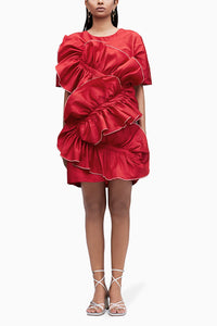 The red eroded taffeta dress is a one of its kind dress. If you are experimental, chic and edgy this is the dress for you. Besides being a statement piece it is also comfortable and light. The fall and fit is straight and the front frill makes it just the right piece for any and every body type. The contrast thread work detail adds to the overall look and appeal of this dress. Get out there and make a statement no one can ignore. This eroded taffeta dress is a essential party dress that is just the right length and is super chic.