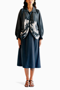 Echo Susie Coord Set, meticulously crafted from luxurious fabric to ensure comfort and style. This stunning ensemble features a top adorned with beautiful black and white prints, creating a mesmerizing cowl effect in the front. Gathers on the sleeves and collar complete the look, adding a touch of sophistication and charm.